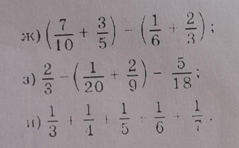 Ж. 7/10+6/10=13/10; 1/6+4/6=5/6; 13/10-5/6=39/30-25/30=14/30=7/15;