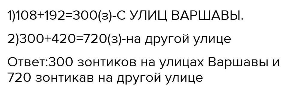Решите пожалуйста задачу Срочно надо.На 108 балконах с улиц Варшавы и на 192 балконах повесили зонтики одинаково на каждом болконе на других улицах украсили на 420 зонтиков больше.Чем на первой улице.Сколько зонтиков украсили дома на каждой из улиц отдельно???