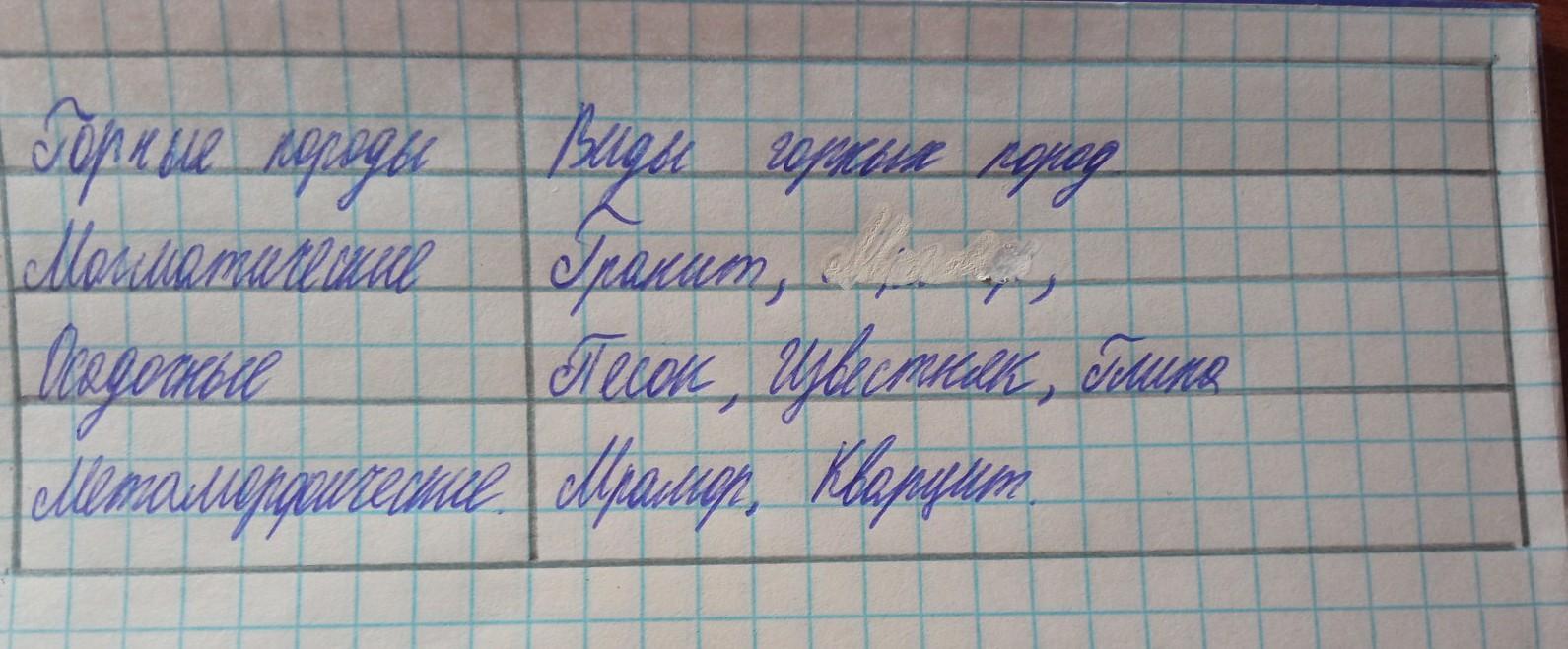 Установите соответствие между видами горных пород и их примерами. Запишите в таблицу соответствующие номера.