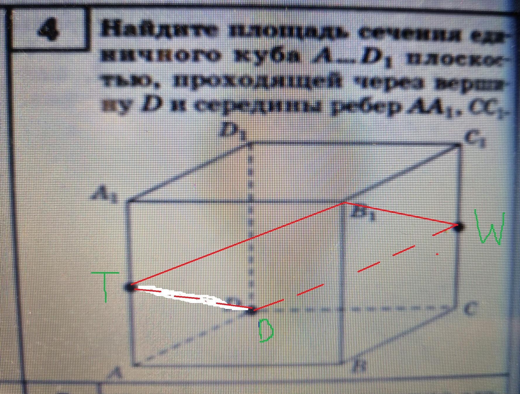 Так как TD║B₁W, то для построения сечения (см. рисунок) достаточно соединить четыре точки: T, D, B₁, W. Площадь данного прямоугольника равна: S₀ = TD * DW. В ΔTAD по теореме Пифагора: TD² = ТА² + АD² ⇒