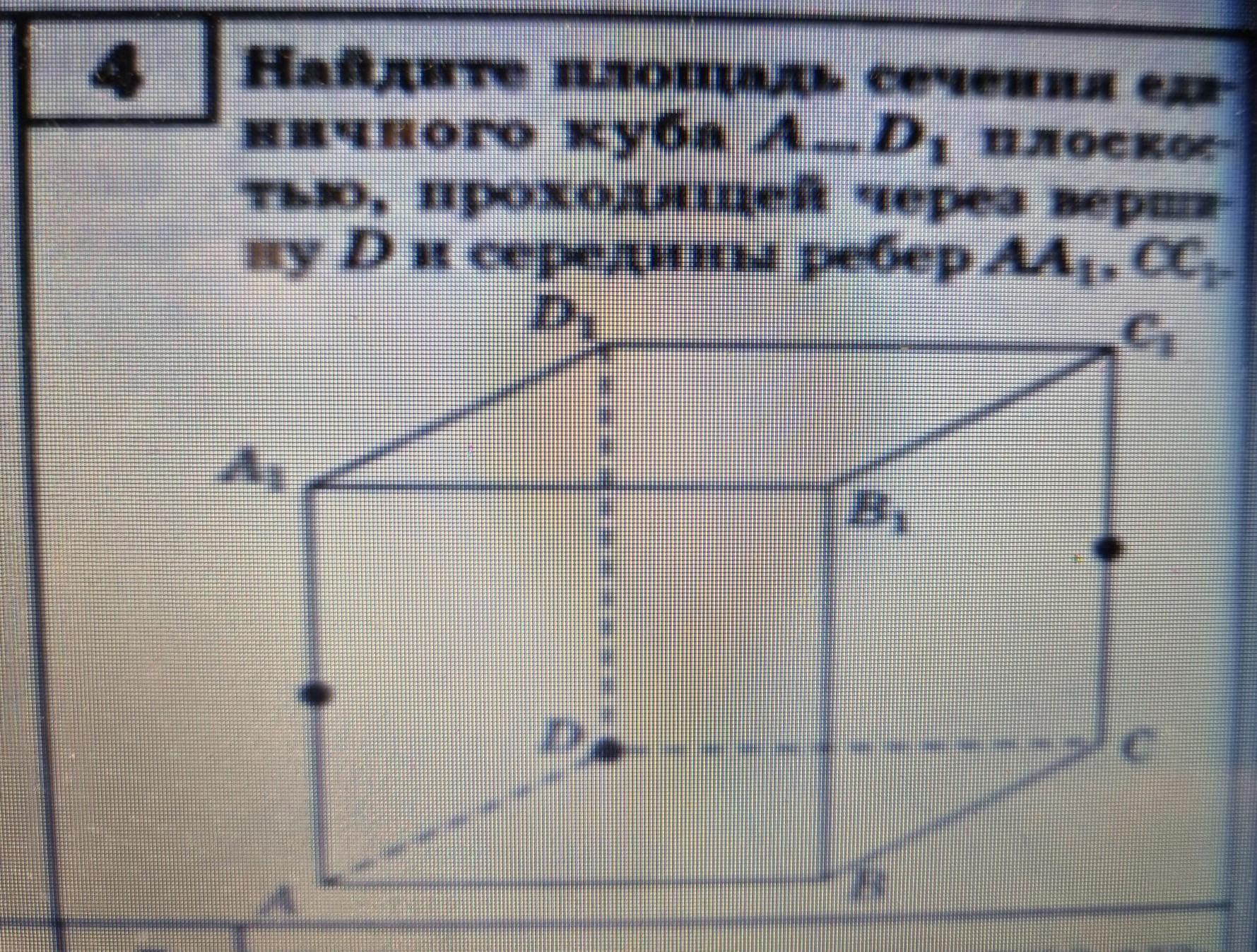 Срооочно Найдите площадь сечения единичного куба A...D1 плоскомтью,проходящей через точку D и середины AA1, CC1