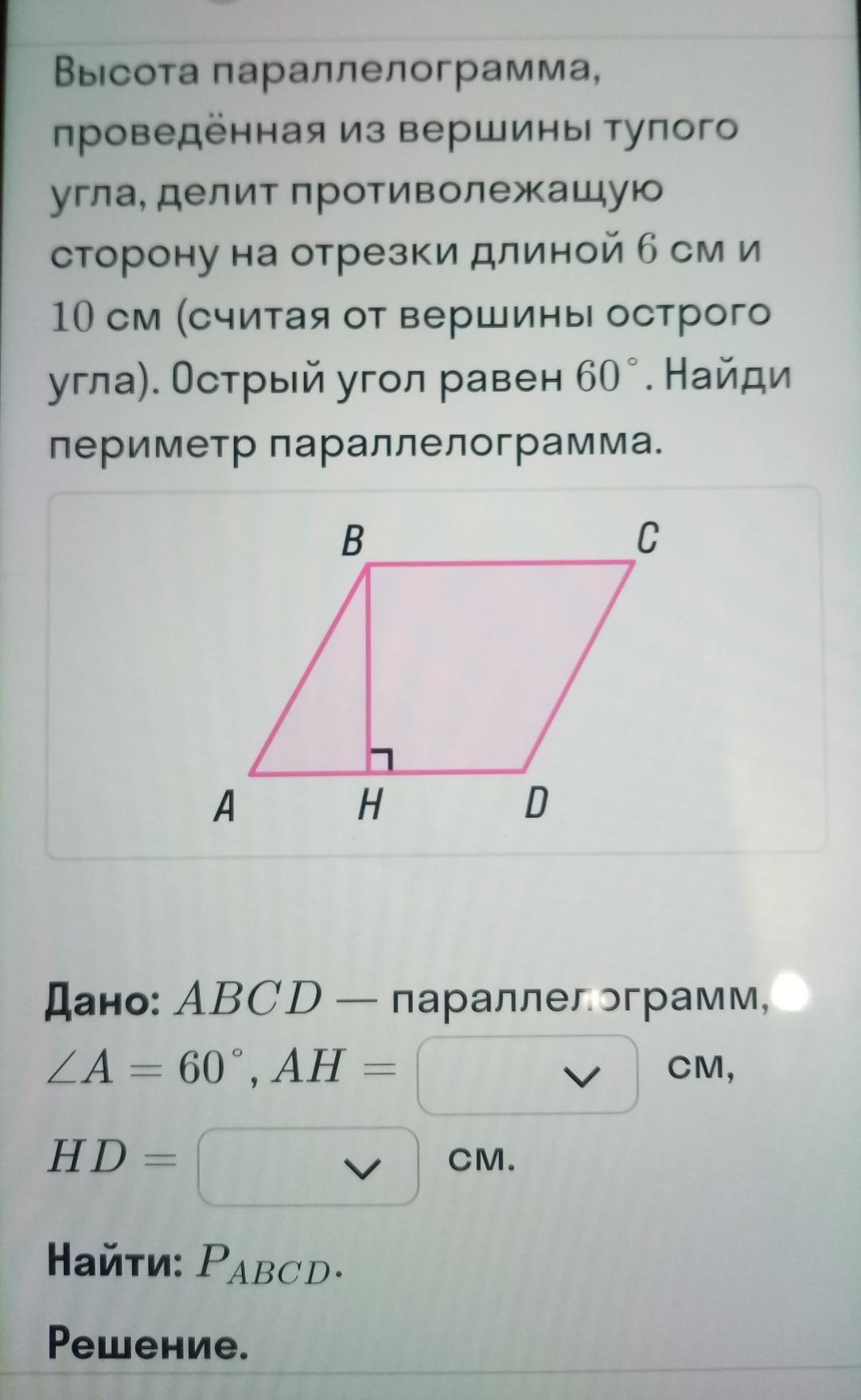 AH=6 см, HD= 10см, значит AD=16см.