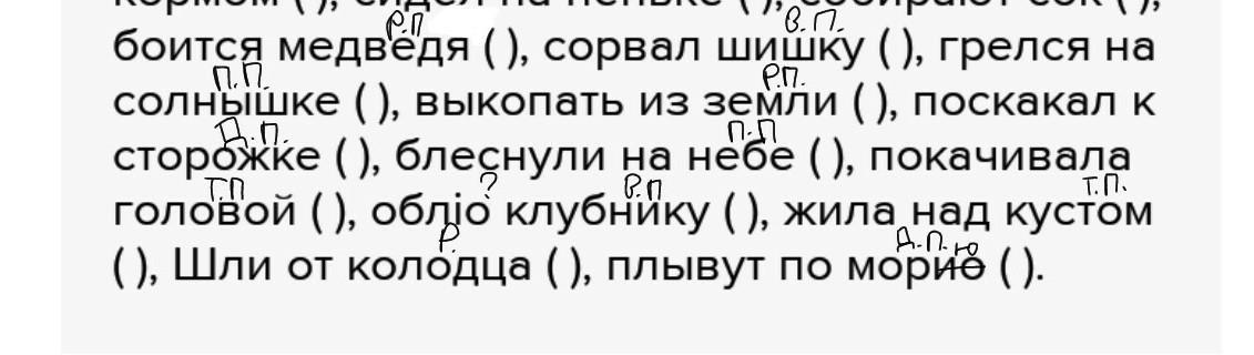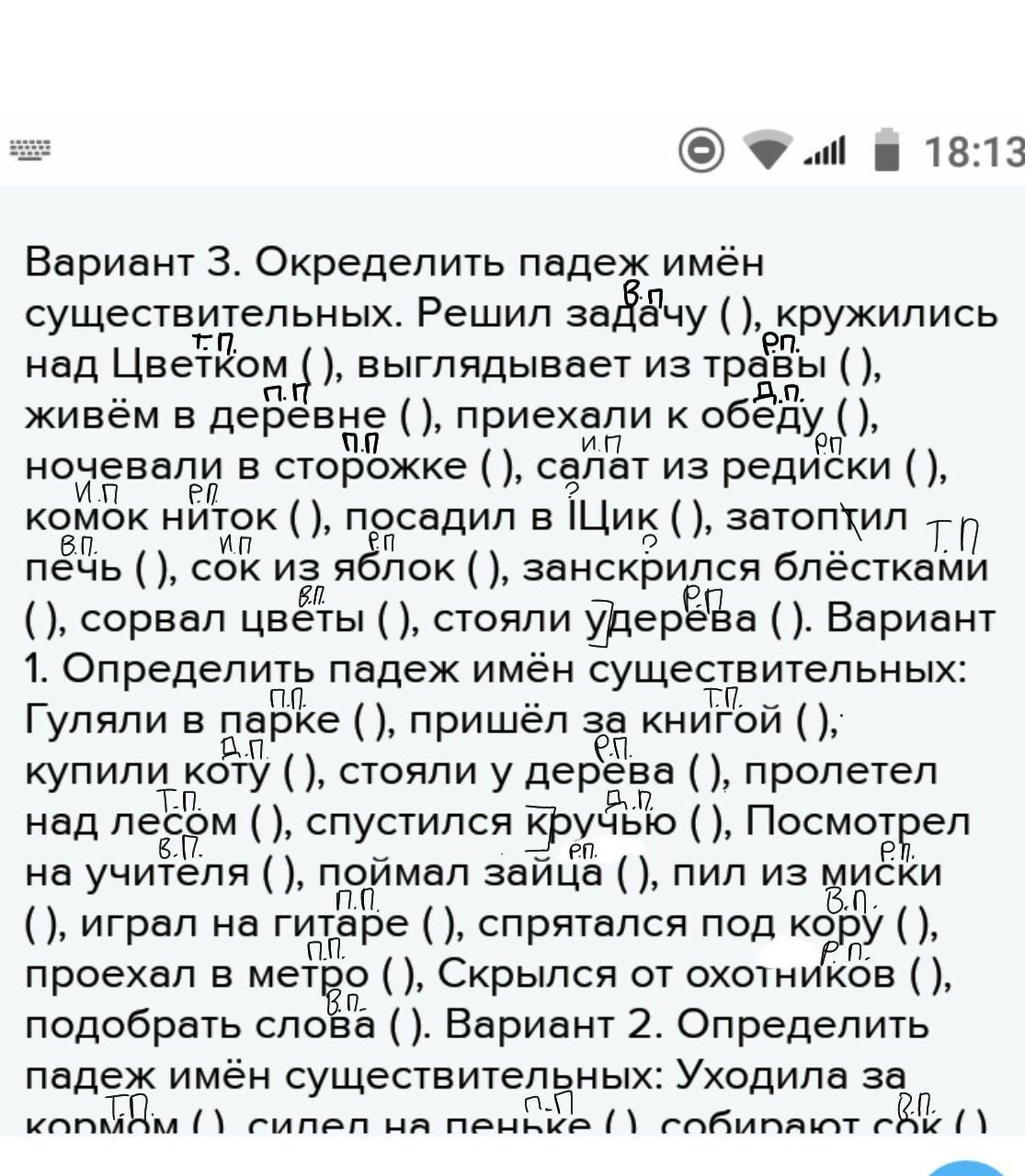Вариант 3. Окределить падеж имён существительных. Решил задачу ( ), кружились над Цветком ( ), выглядывает из травы ( ), живём в деревне ( ), приехали к обеду ( ), ночевали в сторожке ( ), салат из редиски ( ), комок ниток ( ), посадил в ІЦик ( ), затоптил печь ( ), сок из яблок ( ), занскрился блёстками ( ), сорвал цветы ( ), стояли удерева ( ). Вариант 1. Определить падеж имён существительных: Гуляли в парке ( ), пришёл за книгой ( ), купили коту ( ), стояли у дерева ( ), пролетел над лесом ( ), спустился кручью ( ), Посмотрел на учителя ( ), поймал зайца ( ), пил из миски ( ), играл на гитаре ( ), спрятался под кору ( ), проехал в метро ( ), Скрылся от охотников ( ), подобрать слова ( ). Вариант 2. Определить падеж имён существительных: Уходила за кормом ( ), сидел на пеньке ( ), собирают сок ( ), боится медведя ( ), сорвал шишку ( ), грелся на солнышке ( ), выкопать из земли ( ), поскакал к сторожке ( ), блеснули на небе ( ), покачивала головой ( ), обліо клубнику ( ), жила над кустом ( ), Шли от колодца ( ), плывут по морио ( ).