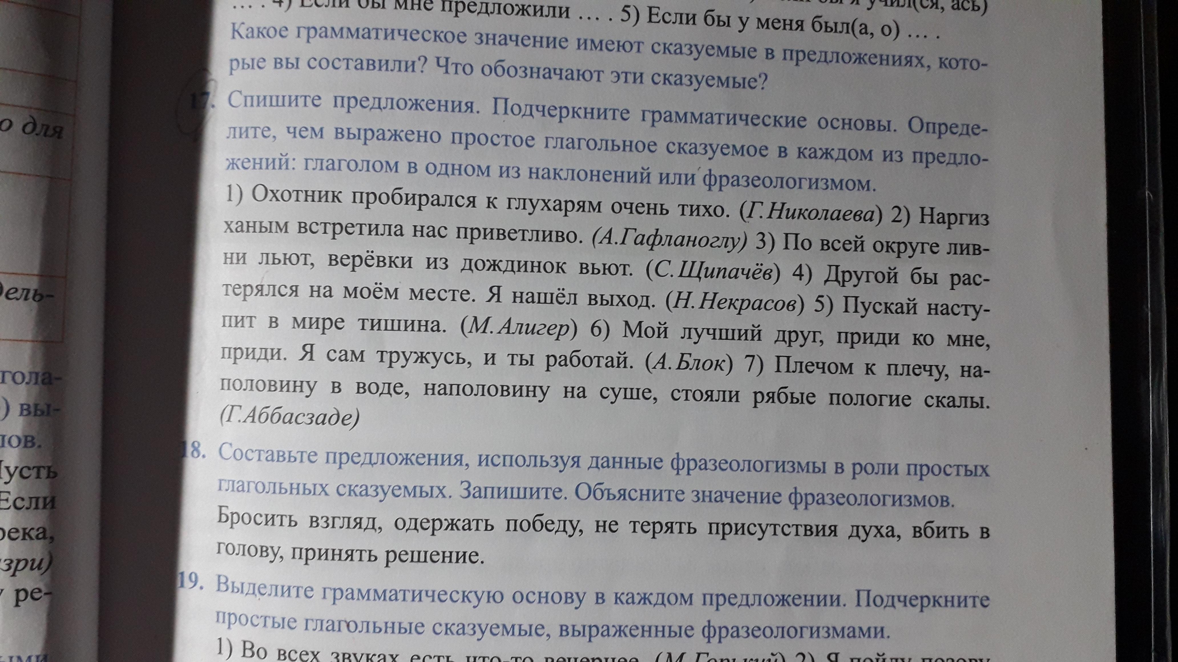 Спишите предложения. Подчеркните грамматические основы. Определите, чем выраженно простое глагольное сказуемое в каждом из предложений: глаголом в одном из накоплений или фразеологизм