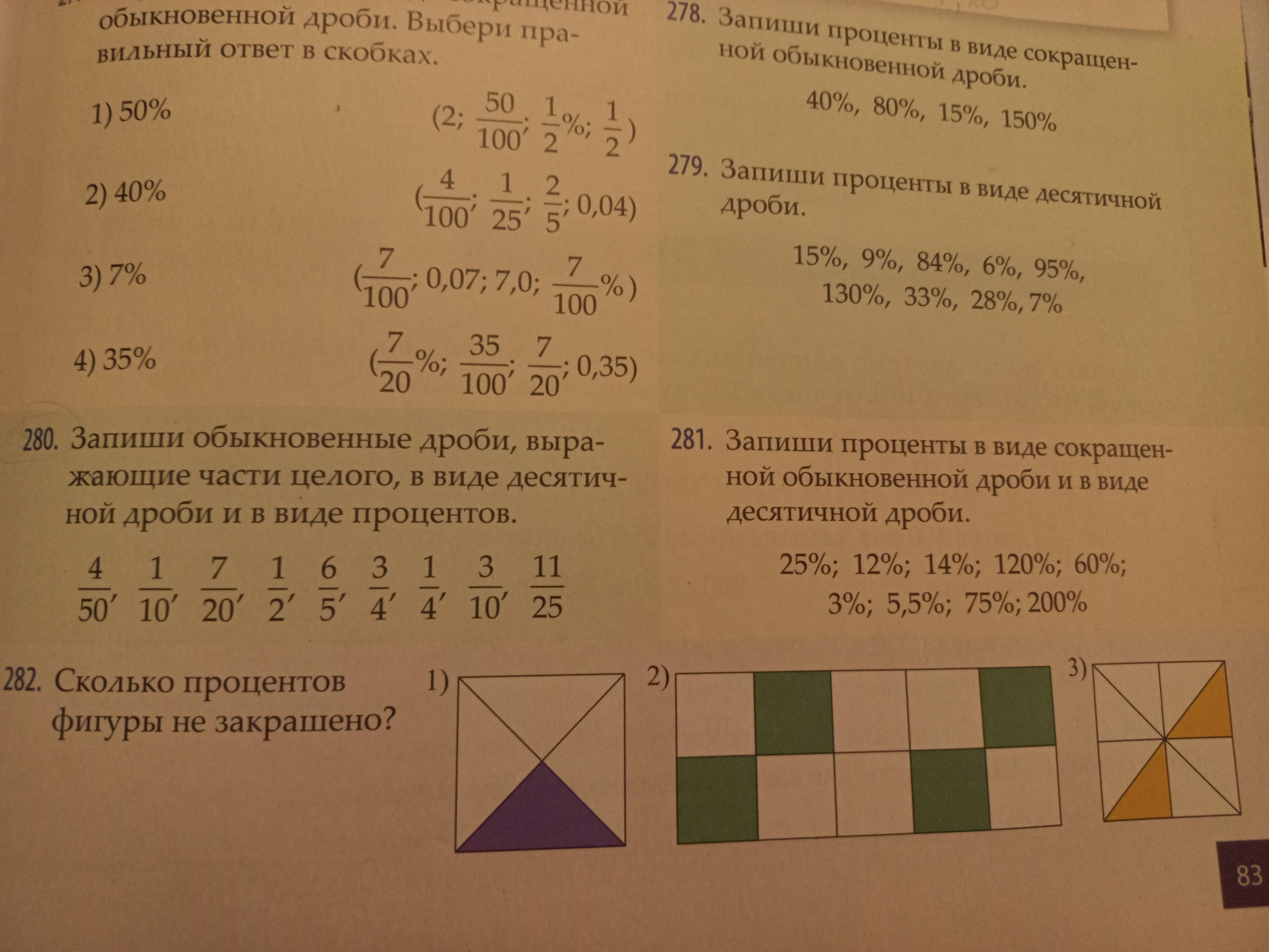 1) закрашено 25%, 2)закрашено 40%, 3) закрашено 25%