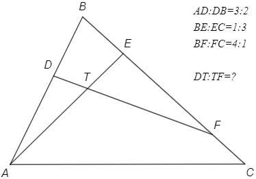 стороне ВС точки Е и F так, что AD:DB=3:2, BE:EC=1:3 и BF:FC=4:1. В