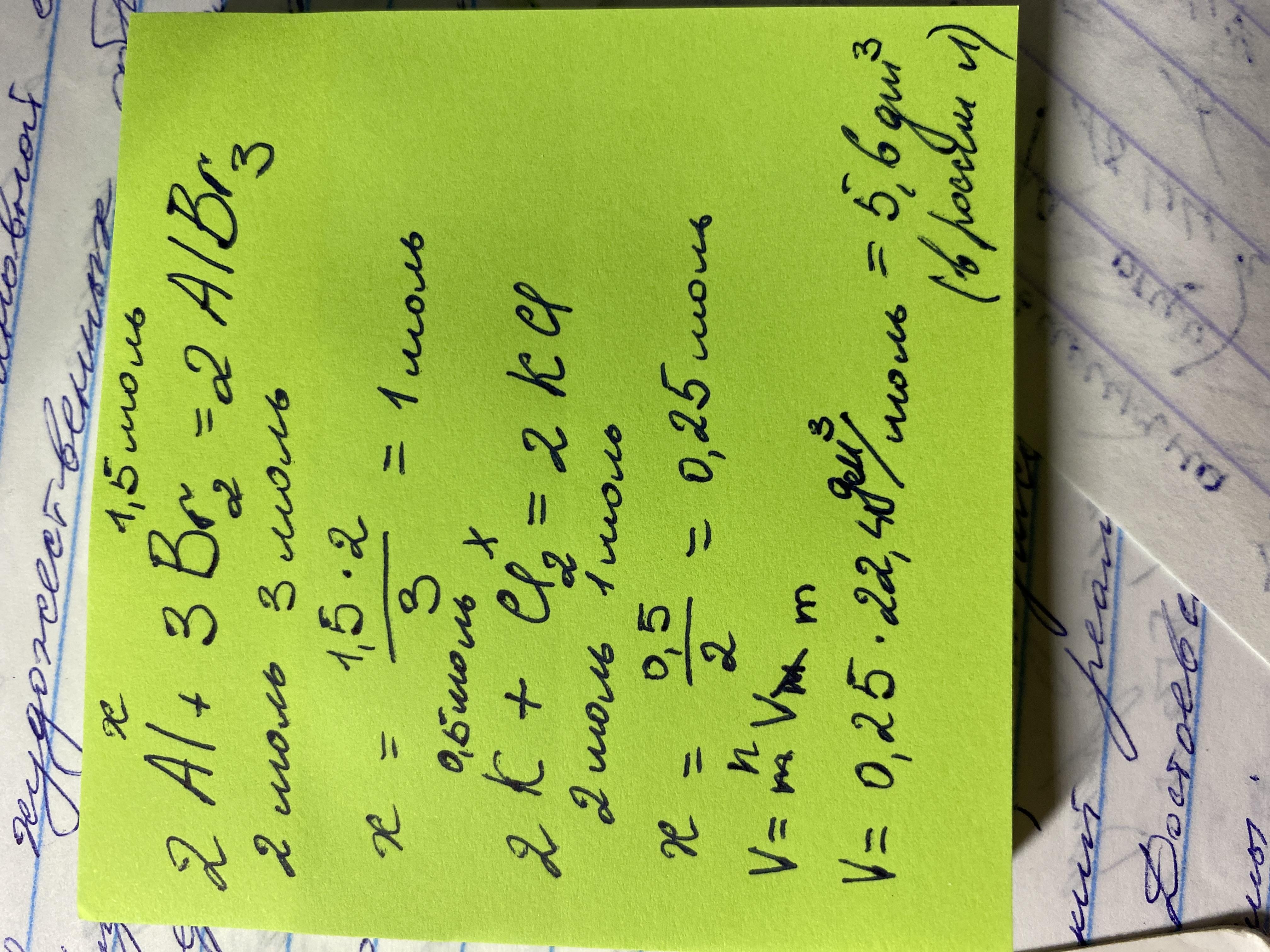 1. По уравнению реакции 2Al + 3Br2 = 2AlBr3 вычислите количество алюминия, необходимо для взаимодействия с 1,5 Моль брома(Br2)
