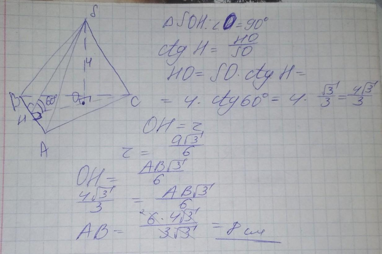 СРОЧНО, Висота правильної трикутної піраміди 4 см, а бічна грань утворює з площиною основи кут 60 градусів. Знайдіть сторону основи піраміди