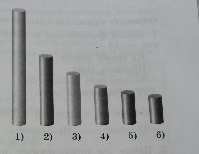 На рисунке даны тела равной массы(справа налево) из: алюминия, цинка, олова, стали, меди, свинца.