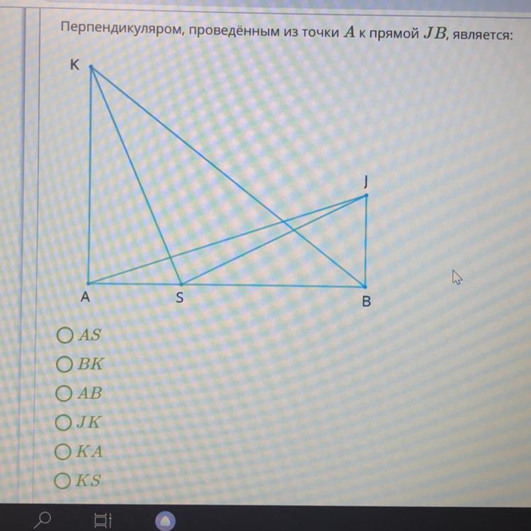 Ответ: Перпендикуляром к прямой JB является прямая АВ. Это третий вариант ответа.