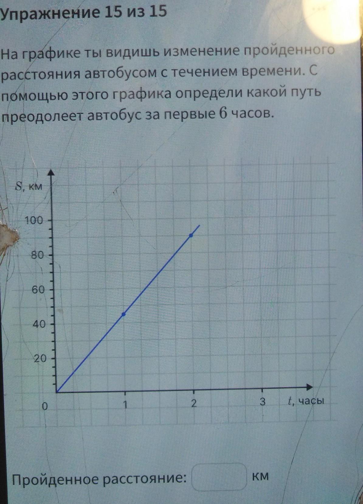 На графике ты видишь изменение пройденного расстояния автобусом с течением времени. С помощью этого графика определи какой преодолеет автобус за первые 6 часов. путь
