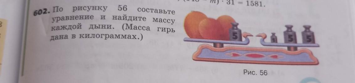 По рисунку 56 составьте 602. По уравнение и найдите массу каждой дыни. (Масса гирь дана в килограммах.)