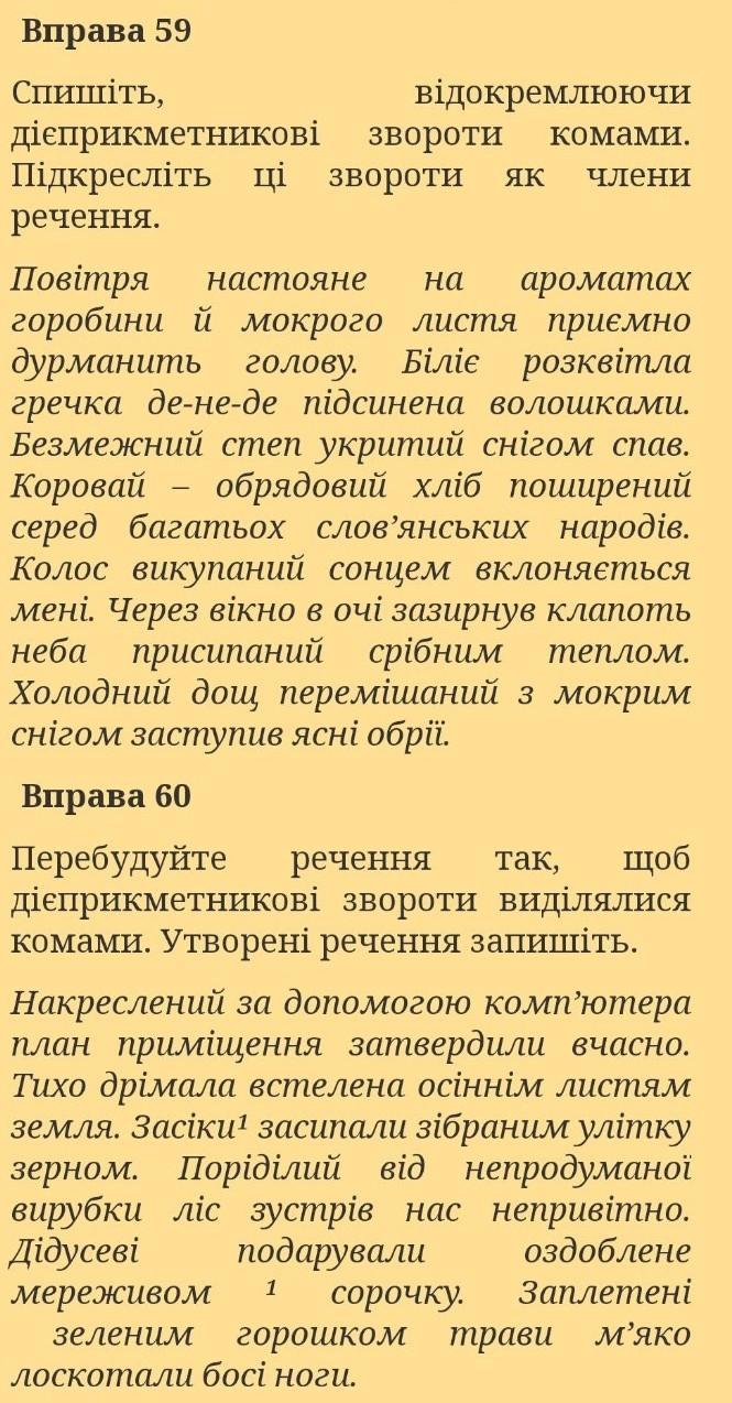 60. План приміщення, накреслений за допомогою комп'ютера, затвердили вчасно. Земля, встелена осіннім листям, тихо дрімала. Зерном, зібраним улітку, засипали засіки. Ліс, поріділий від непродуманої вирубки, зустрів нас не привітно. 1 сорочку, оздоблену мереживом, подарували дідусеві. Трави, заплетені зеленим горошком, м'яко лоскотали босі ноги.