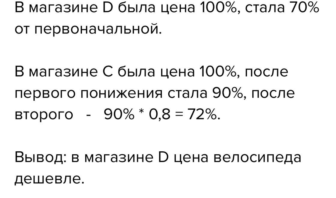 В магазинах С и D одинаковые велосипеды продавались по одной и той же цене.В магазине С цену велосипеда сначала понизили на 10%,а затем - ещё на 20%.В магазине D цену такого же велосипеда понизили на 30%.В каком магазине цена велосипеда стала дешевле ?На сколько процентов .