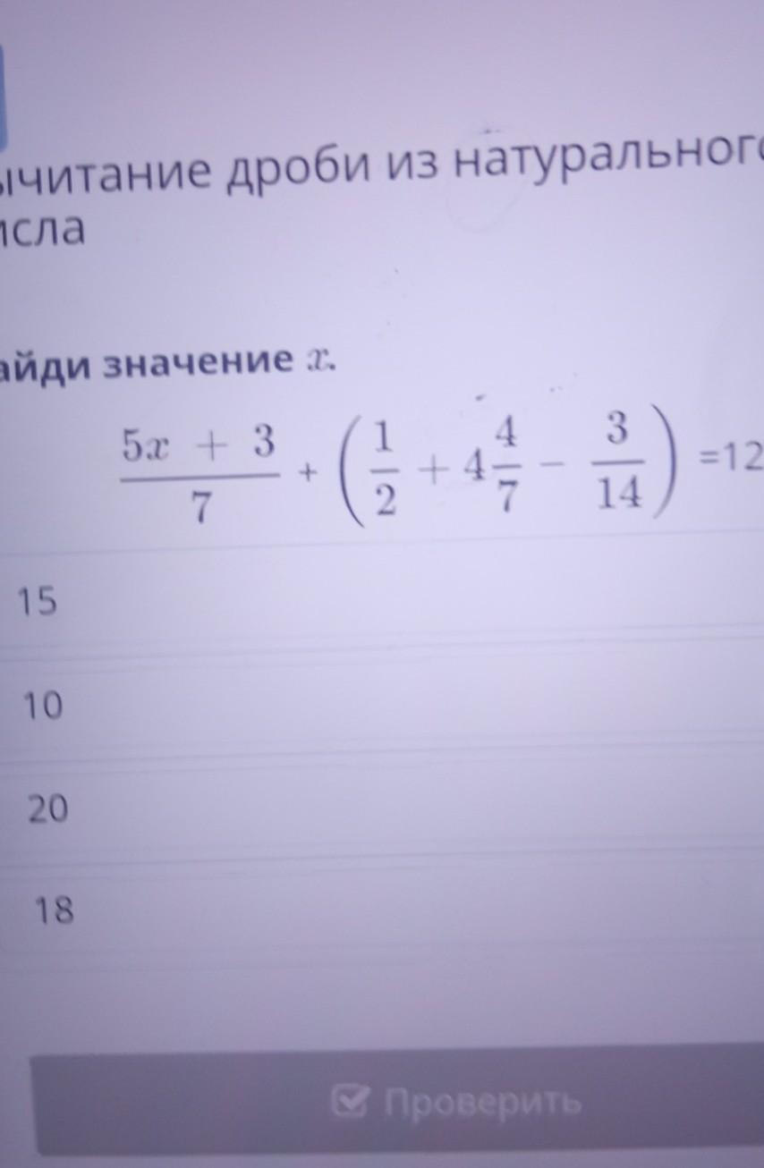 Вычитание дроби из натурального ЧИСла Найди значение х 5х + 3 4. 3 + 1 +4 2 ) =12 7 14 15 10 20 18 В Проверить Назад