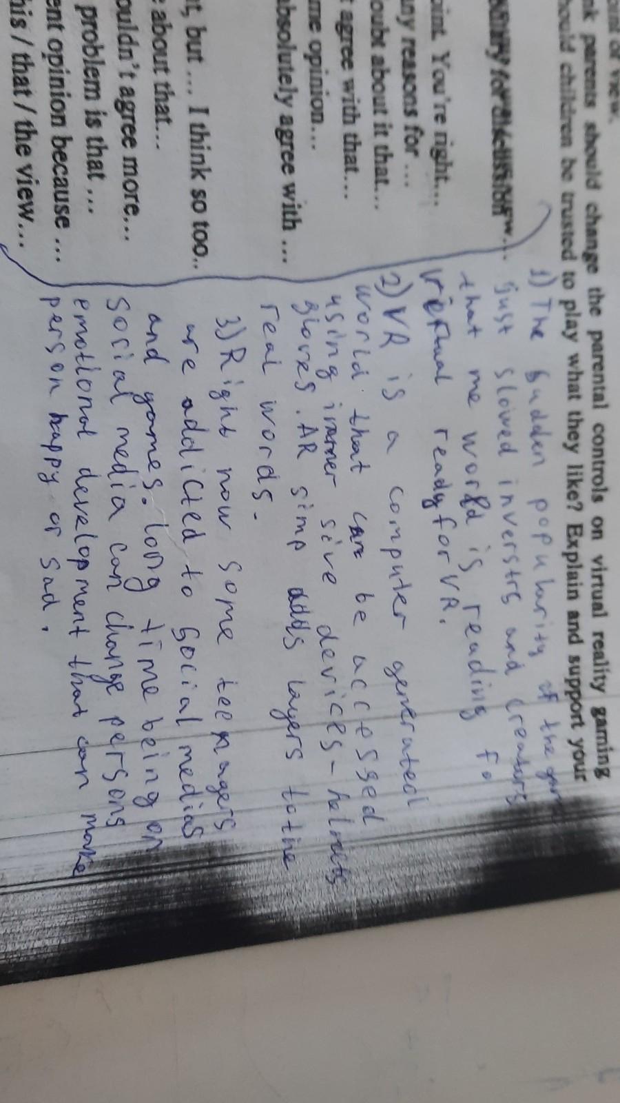 WRITTING Task 2. Possible questions for discussion. 1. Do you think virtual reality will be popular in future? Explain your opinion. 2. How are virtual reality and augmented/integral reality the same and how are they different? Which of the two technologies do you expect to be more popular in the future? Explain and support your opinion. 3. Do you think virtual reality and augmented/integral reality technologies can impact our social-emotional development or interpersonal skills? How and in what ways? Explain and support your point of view. 4. Do you think parents should change the parental controls on virtual reality gaming systems? Or, should children be trusted to play what they like? Explain and support your position. You can use this vocabulary for discussion