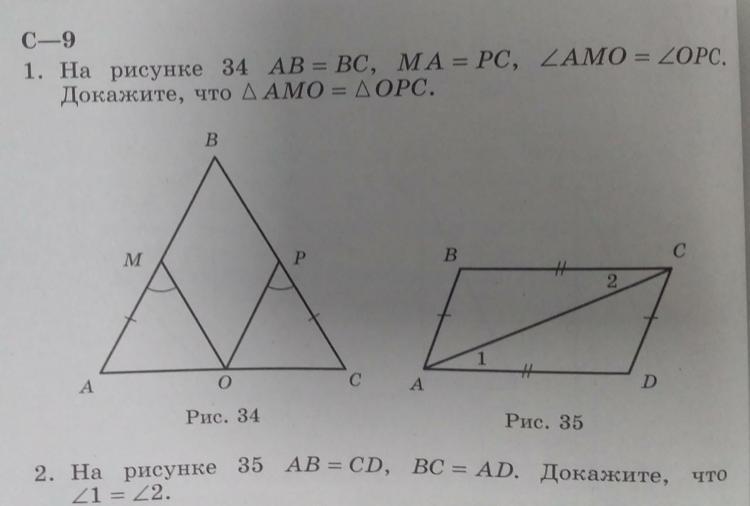 Объяснение: 1 ) Так как АВ = ВС, то треугольник АВС- равнобедренный. В равнобедренном треугольнике углы при основании равны. Т.е. угол А = углу С. Получается, что сторона АМ и прилежащие к ней углы равны стороне РС и прилежащим к ней углам. Следовательно треугольники АМО и РСО раны по второму признаку равенства треугольников.
