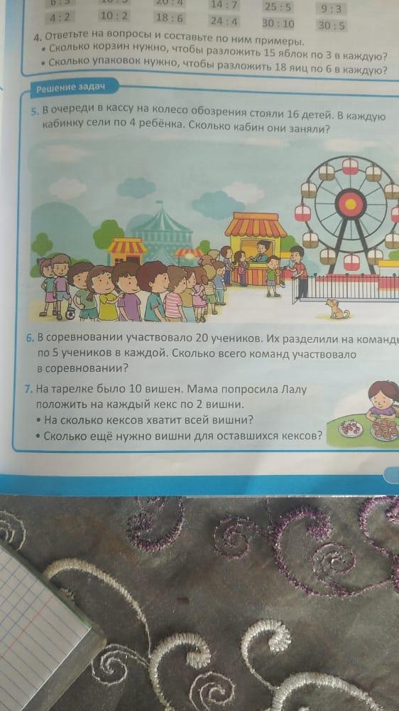 Примечание: если бы, к примеру, было не 10 вишен, а скажем, 11, то тут да 1 вишня останется без дела и нужно было бы еще 1 вишенку для кекса, чтобы на всё хватило, тем не менее в данной 7 задачи все 10 вишен на тарелке хватило на 5 кексов, так как их распределили по 2 вишни на каждый кекс, то есть: