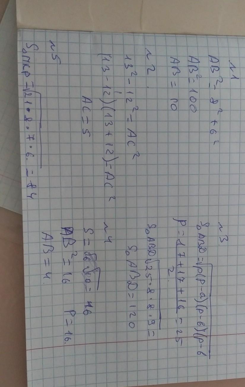 5) либо Герон; либо треугольник (13;14;15) делиться высотой проведённой к стороне 14 на два прямоугольных треугольника со сторонами (13;5;12) и (15;12;9) S=1/2*12*5+1/2*12*9=30+54=84
