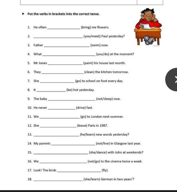 Put the verbs in brackets into the correct tense. 1 He often (brine) me flowers. 2. (you/meet) Paul yesterday? 3. Father (swim) now. 4. What (you/do) at the moment? 5. Mr Jones (paint) his house last month. 6. They (clean) the kitchen tomorrow. 7. She (go) to school on foot every day, 8. It (be) hot yesterday. 9. The baby (not/sleep) now. 10. He never (drive) fast. 11. We (go) to London next summer. 12. She (leave) Paris in 1987. 13. (he/learn) new words yesterday? 14. My parents (not/live) in Glasgow last year. 15. (she/dance) with John at weekends? 16. We (not/go) to the cinema twice a week. 17. Look! The birds (fly). 18. (she/learn) German in two years'? помогите пожалуйста срочно даю 30 балов!!!