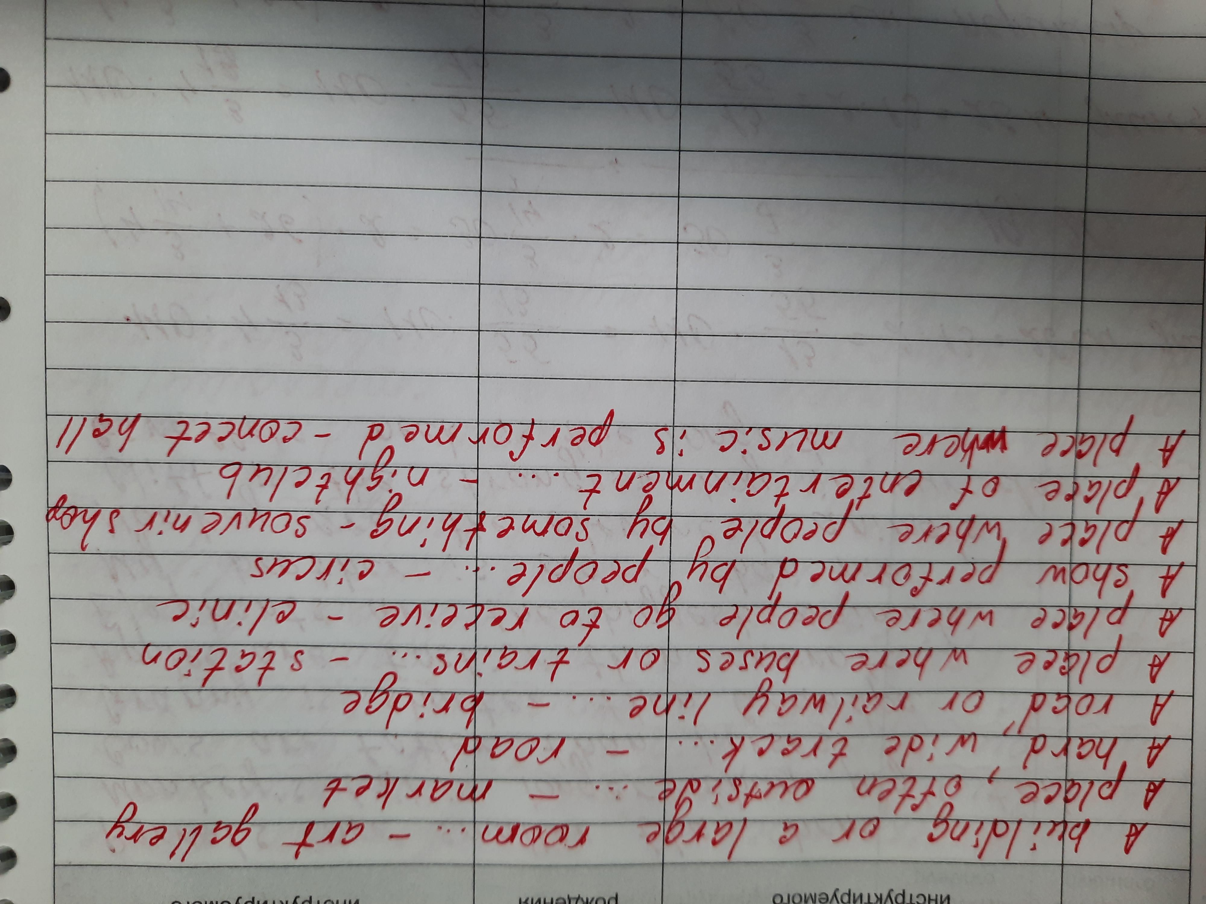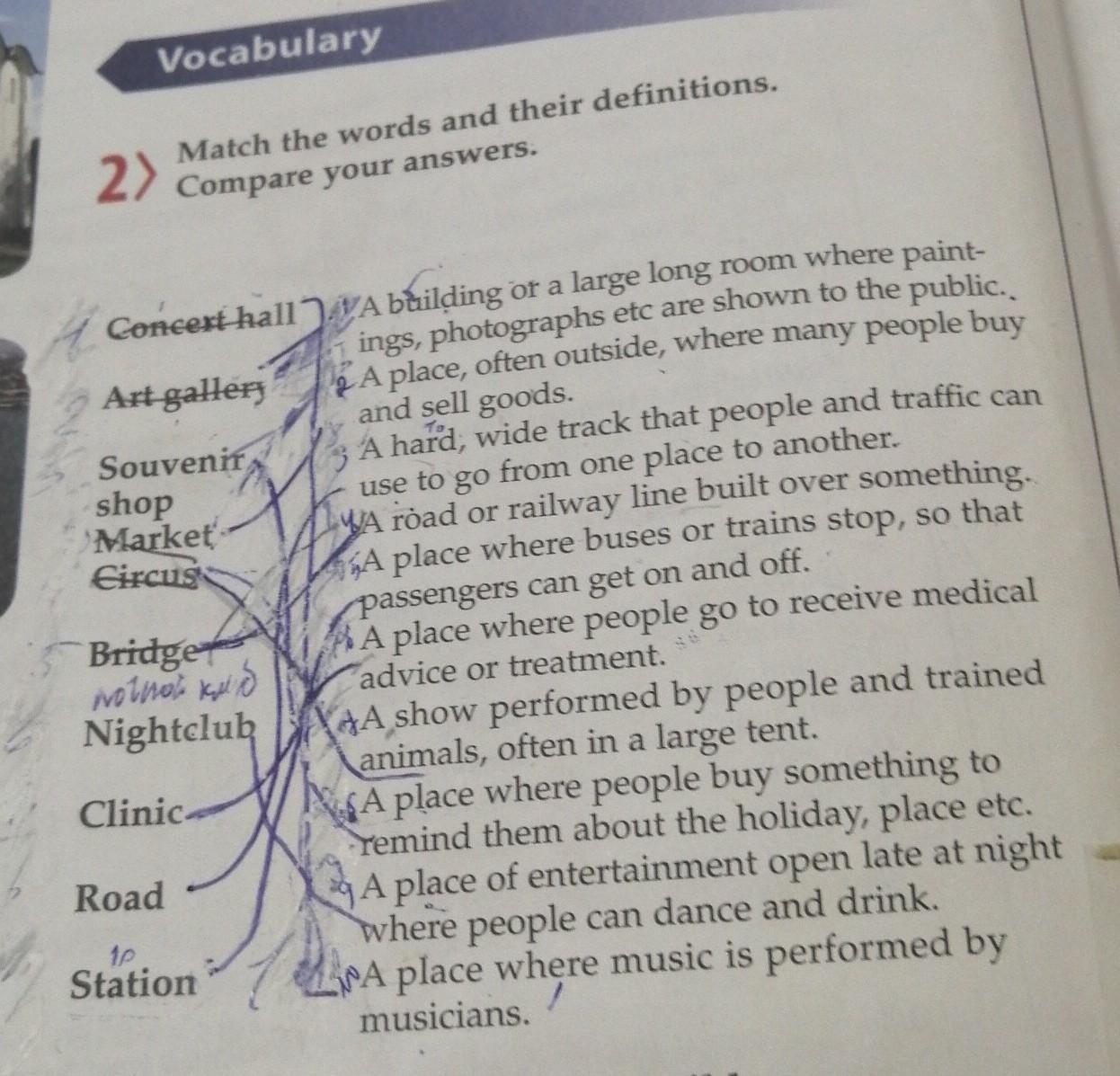 Здание или большая длинная комната, в которой публике демонстрируются картины, фотографии и т. Д. место, часто снаружи, где многие люди покупают и продают товары. Жесткая и широкая дорога, по которой люди и трафик могут перемещаться из одного места в другое. дорога или железнодорожная линия, построенная над чем-то. Место, где останавливаются автобусы или поезда, чтобы пассажиры могли садиться и выходить. Место, куда люди обращаются за медицинской консультацией или лечением. Шоу в исполнении людей и дрессированных животных, часто в большом шатре. Место, где люди покупают что-нибудь, чтобы напомнить им о празднике, месте и т. Д. Место развлечений, открытое до поздней ночи, где люди могут потанцевать и выпить. Место, где исполняют музыку музыканты.