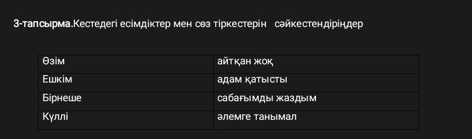 3-тапсырма.Кестедегi есiмдiктер мен сөз тiркестерiн сәйкестендiрiндер
