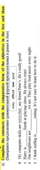 a) Complete the sentences with the comparative form of the adjectives in the box and than. noisy difficult bad good 0 My computer skills are worse than my friend Peter's. He's really good! 1 Harry is Sarah at playing chess. He always wins! 2 Our neighbours are 3 I think surfing is we are. They play loud music every night. sailing. It's not easy to learn how to do it.