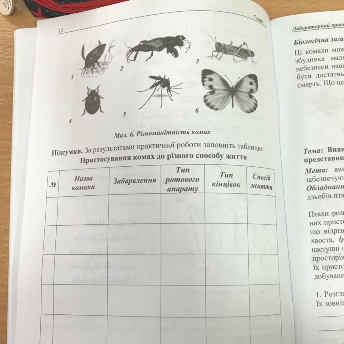 Помогите! 4. Розгляньте зображених на малюнку 6 комах. Визначте за їх зовнішньою будовою який спосіб життя вони ведуть. Відповідь занесіть до таблиці.