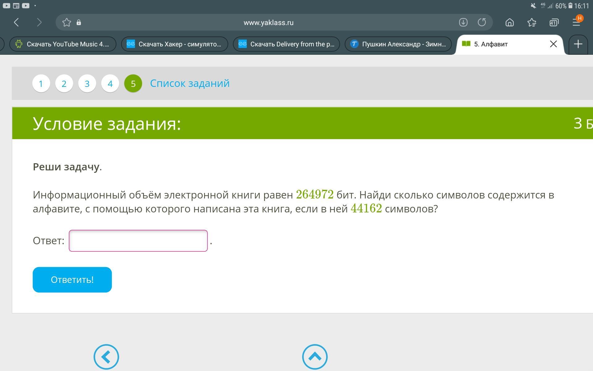 Информационный объём электронной книги равен 264972 бит. Найди сколько символов содержится в алфавите, с помощью которого написана эта книга, если в ней 44162 символов?