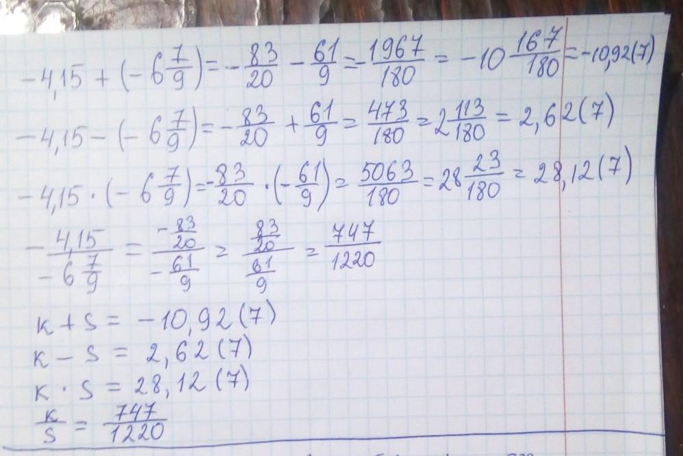 2) -4,15 - (-6. 7/9) = -4. 15/100 + 6. 7/9 = -4. 3/20 + 6. 7/9 = -4. 27/180 + 6. 140/180 = 2. 113/180 = 2,62(7)