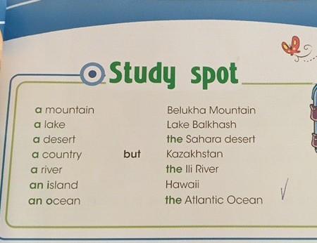 O Study spot a mountain a lake a desert a country a river an island but Belukha Mountain Lake Balkhash the Sahara desert Kazakhstan the Ili River Hawaii the Atlantic Ocean an ocean