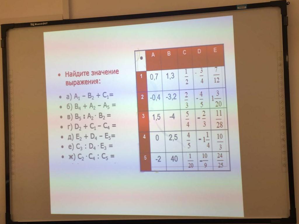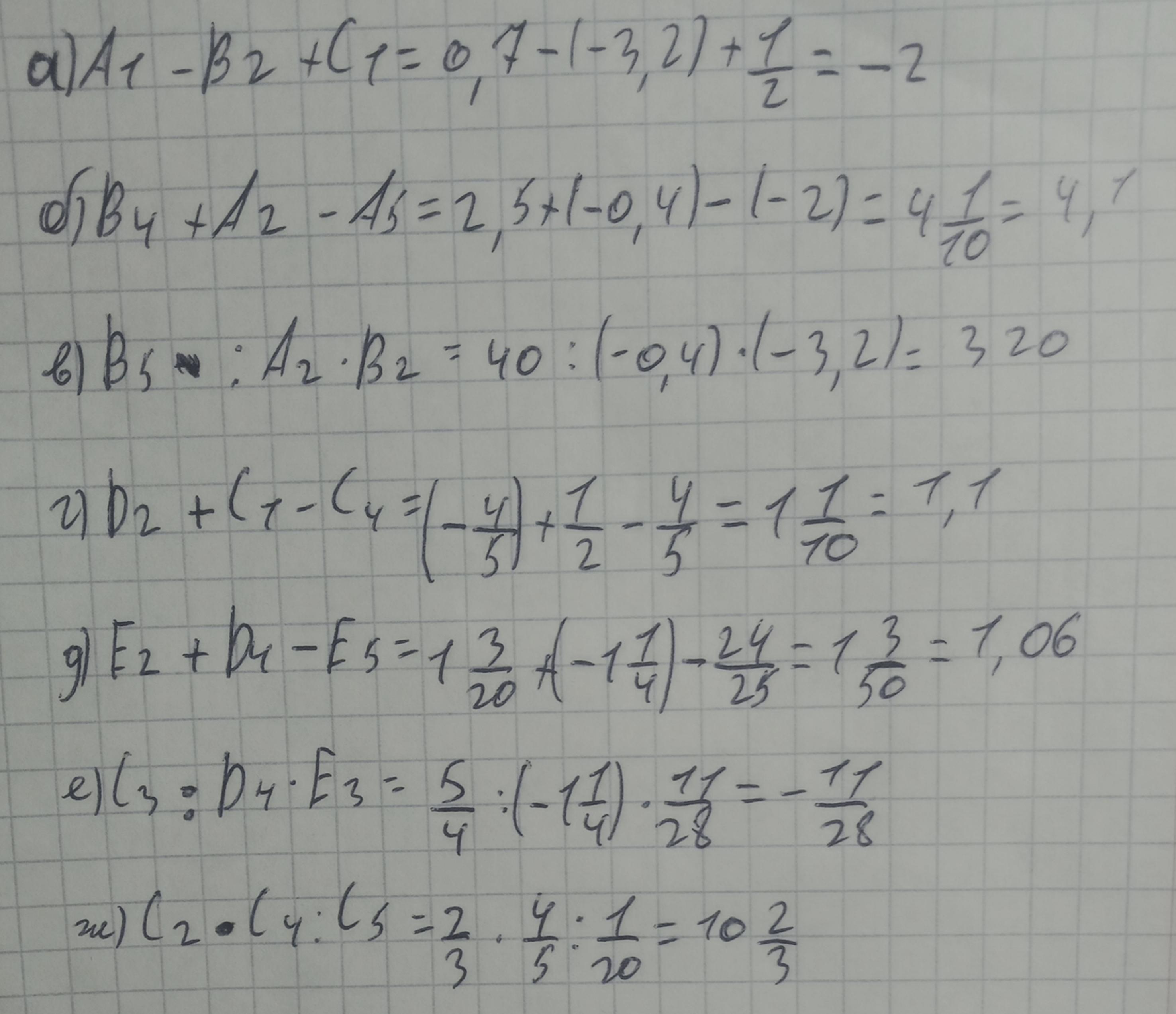 • Найдите значение выражения: a) A_{1} - B_{2} + C_{1} = 6) B_{4} + A_{2} - A_{5} = • B) B_{5} / A_{2} * B_{2} = r) D_{2} + C_{1} - C_{4} = A) E_{2} + D_{4} - E_{5} = e) C_{3} / D_{4} * E_{3} = X)C 2 /C 4 :C 5 = 1 A B C D E 7 Ic = 314 4 4 12 -0,4 1,3 2 -3,2 c1|m 1 20 11 3 0,7 u_{2} 4 4/5 -4 - 2/3 28 10 0 2,5 1 14 3 5 -2 40 1/20 - 10/9 24/25