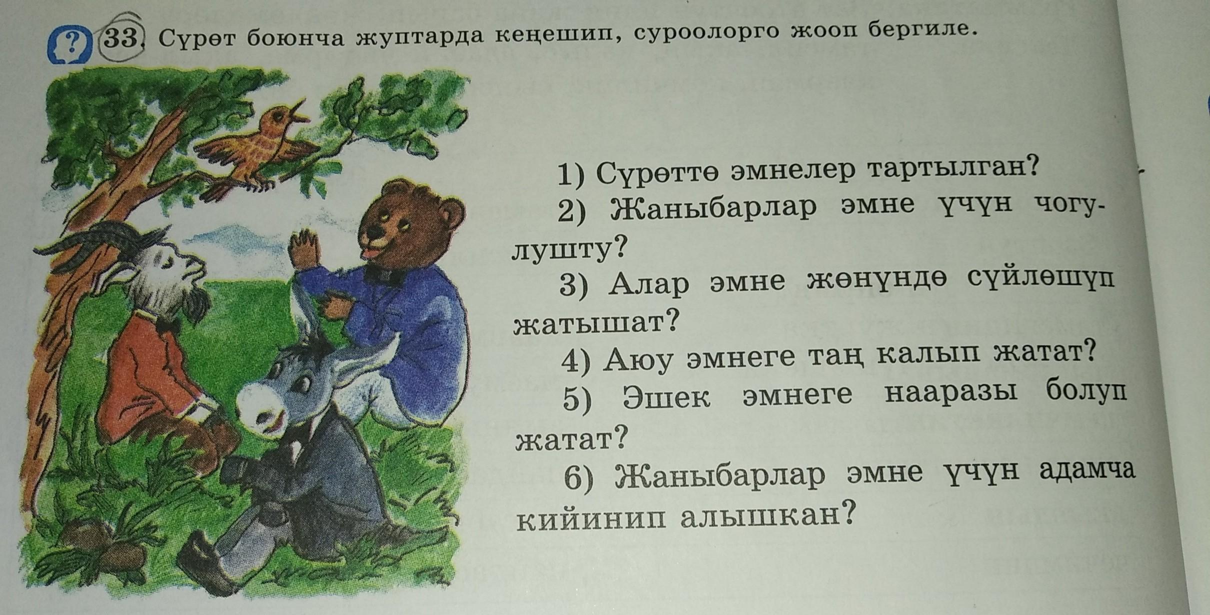 5) Эшек эмнеге нааразы болуп жатат? 6) Жаныбарлар эмне үчүн адамча кийинип алышкан?