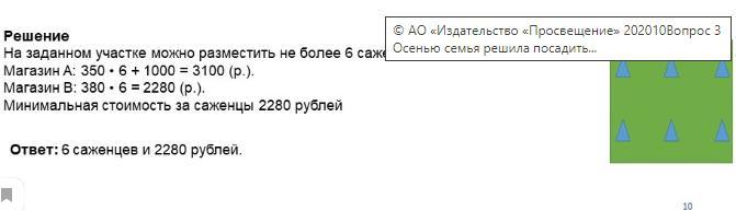 Осенью семья решила посадить яблони. Были изучены цены на саженцы в различных магазинах. В магазине А саженцы предлагались по цене 350 р. за штуку, и дополнительно необходимо заплатить за доставку на дачу 1000 р. В магазине В саженцы стоили 380 р. за штуку, но с бесплатной доставкой. Известно, что при посадке расстояние между саженцами должно быть не менее 4 м, а между рядами - не менее 6 м. Какую минимальную сумму в рублях необходимо заплатить за максимальное количество саженцев, которые можно посадить на участке площадью 10 м х 10 м?