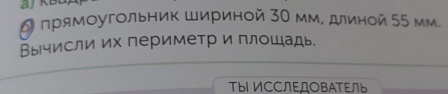 9 9 Начерти. а) квадрат со стороной 25 мм; прямоугольник шириной 30 мм, длиной 55 мм. Вычисли их периметри площадь. P =uu Poza?