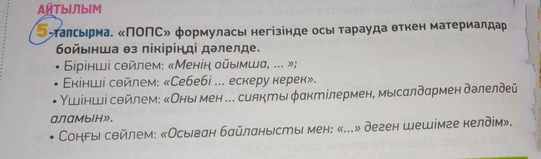 АЙТЫЛЫМ 5 - тапсырма . « ПОПС » формуласы негізінде осы тарауда өткен материалдар бойынша өз пікірінді дәлелде . ● Бiрiншi сейлем : « Менің ойымша , ... » ; Екінші сөйлем : « Себебі ... ескеру керек » . • Үшінші сөйлем : « Оны мен … .. сияқты фактілермен , мысалдармен дәлелдей аламын » • Соңғы сөйлем : « Осыған байланысты мен : « ... >> деген шешімге келдім » . помогите пожалуйста!!