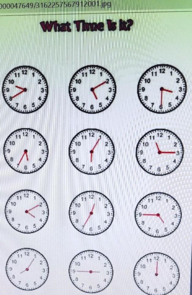 сверху вниз, справа налево. Twenty minutes to ten, ten minutes past five, a half past three, twenty-five minutes to six, five minutes past six, quarter past eleven, ten minutes past four, twenty-five minutes to one, quarter to five, five minutes past eight, quarter to three, twelve o'clock