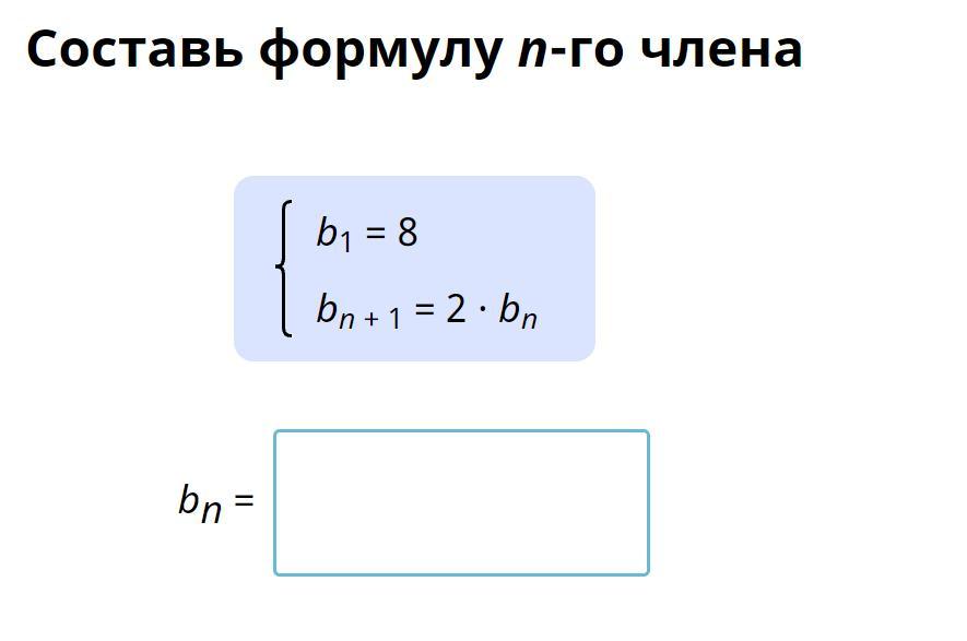 \left\{\begin{array}{l}b_1=8\\b_{n+1}=2\cdot b_{n}\end{array}\right\ \ \ \Rightarrow \ \ \ \ b_{n}=2\cdot b_{n-1}\\\\\\\{b_{n}\}:\ 8\ ,\ 16\ ,\ 32\ ,\ 64\ ,\ ...\ \ \ \ \ \ \boxed{\ b_{n}=2^{n+2}\ }
