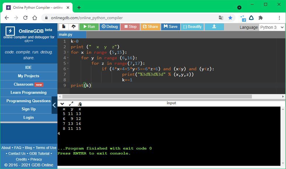 if (4*x+4+5*y+5==6*z+6) and (x<y) and (y<z):