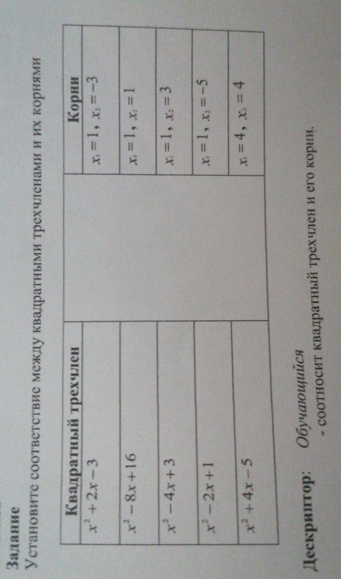 Установите соответствие между квадратными трехчленами и их корнями Квадратный трехчлен x² + 2x-3 Корни х = 1, x, = -3 х* — 8х+16 х = 1, x = 1 х? -4х + 3 х = 1, х = 3 х" - 2x+1 х = 1, x = -5 х+4х- x = 4, x. = 4 Х.