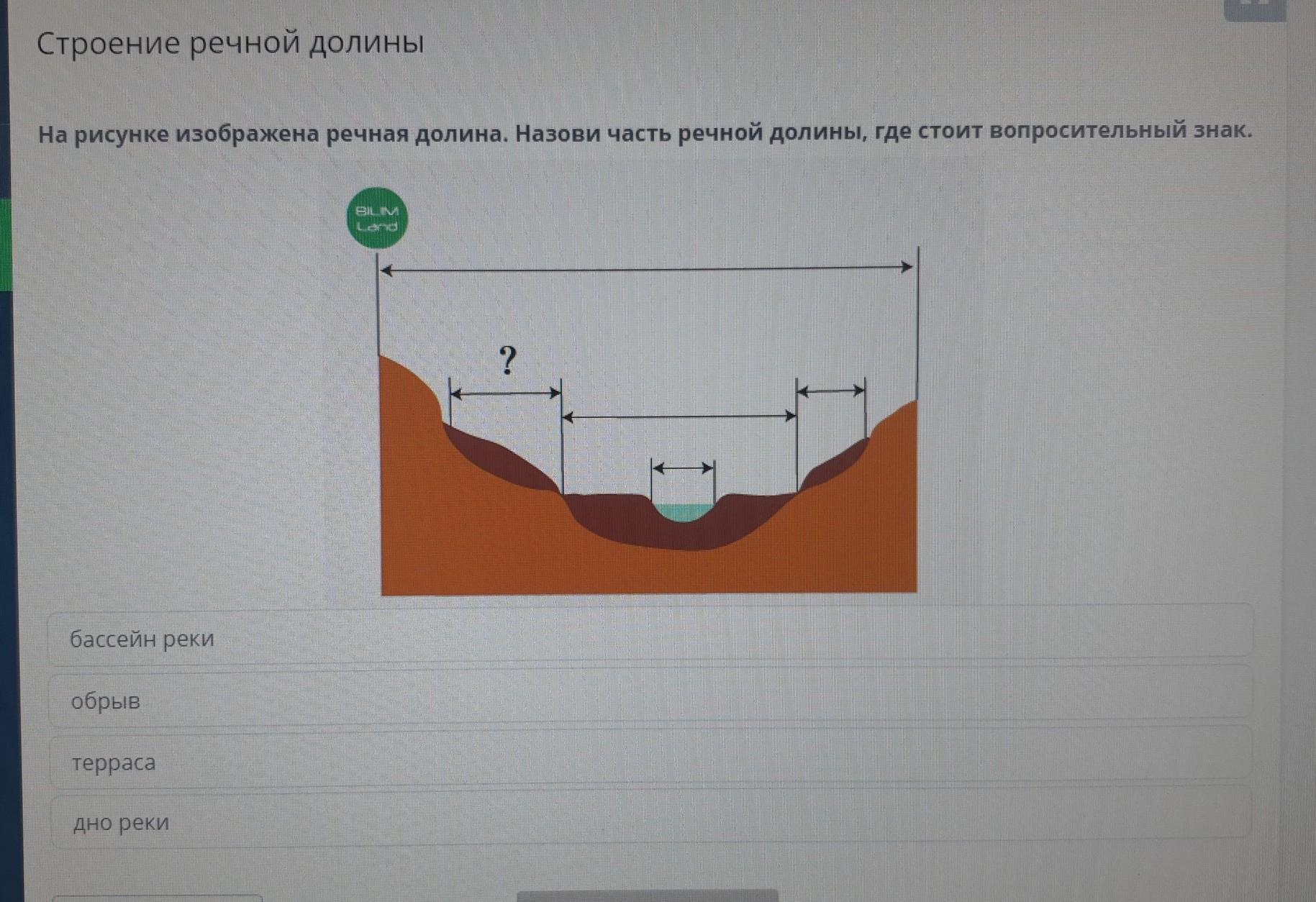 на рисунке изображена речная долина. назови часть речной долины, где стоит вопросительный знак.