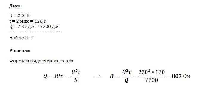 При напряжении 220В в лампе в течение 2мин выделяется 7,2 кДж энергии.Определите сопротивление нити лампы