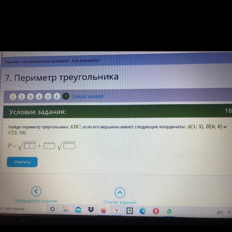 Найди периметр треугольника ABC, если его вершины имеют следующие координаты: А(1; 3); B(6,6); C(2;10)
