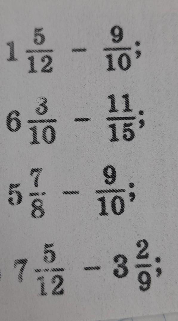 1. 5/12-9/10=7/10; 6.3/10-11/15=1.9/10; 5.7/8-9/10=2.39/40;7.5/12-3.2/9=5.1/3