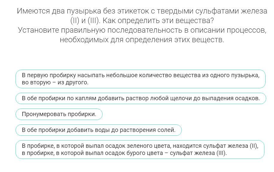 5. В пробирке, в которой выпал осадок зелёного цвета, находится сульфат железа (II), в пробирке, в которой выпал осадок бурого цвета - сульфат железа (III).