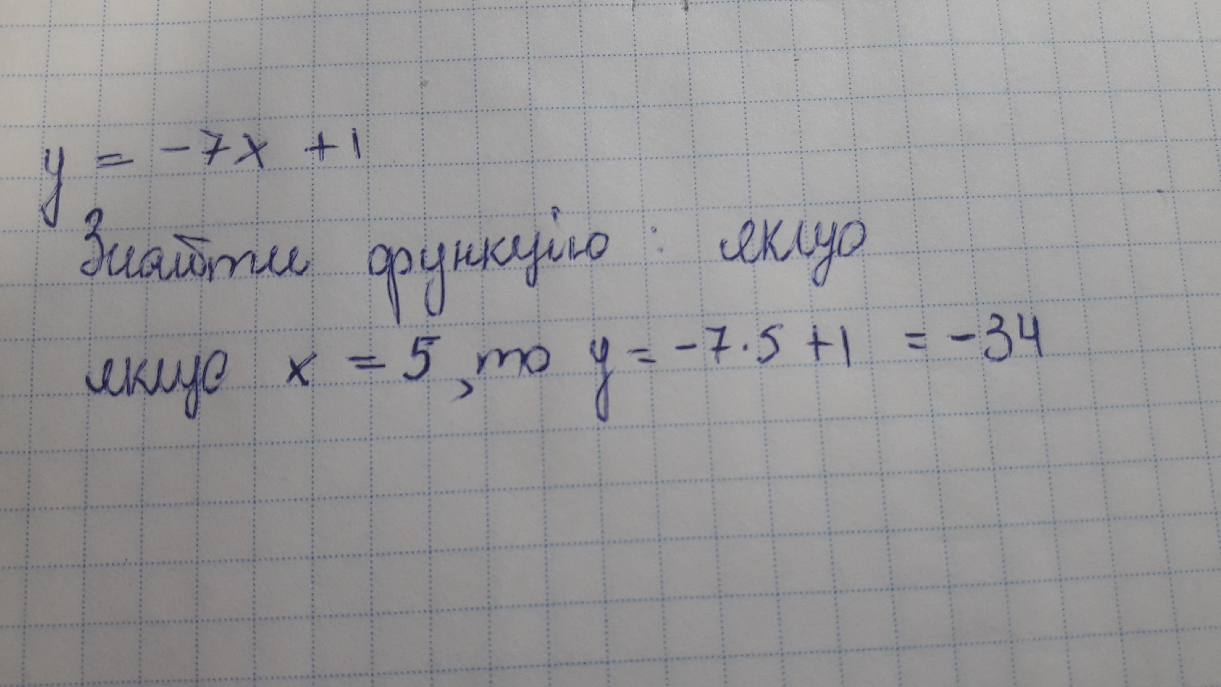 Линейная функция задана формулой: у = -7х+1 Найдите значение функции, если значение аргумента равно: 5.