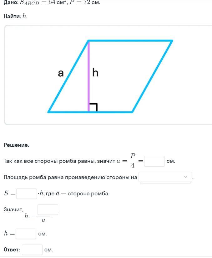 Объяснение: Так как периметр ромба = 72 см, то сторона ромба а = Р/4 = 72/4 = 18 см. Площадь ромба равна произведению стороны ромба высоту ромба: S = a*h. Отсюда h = S/а = 54 см²/18 см = 3 см.