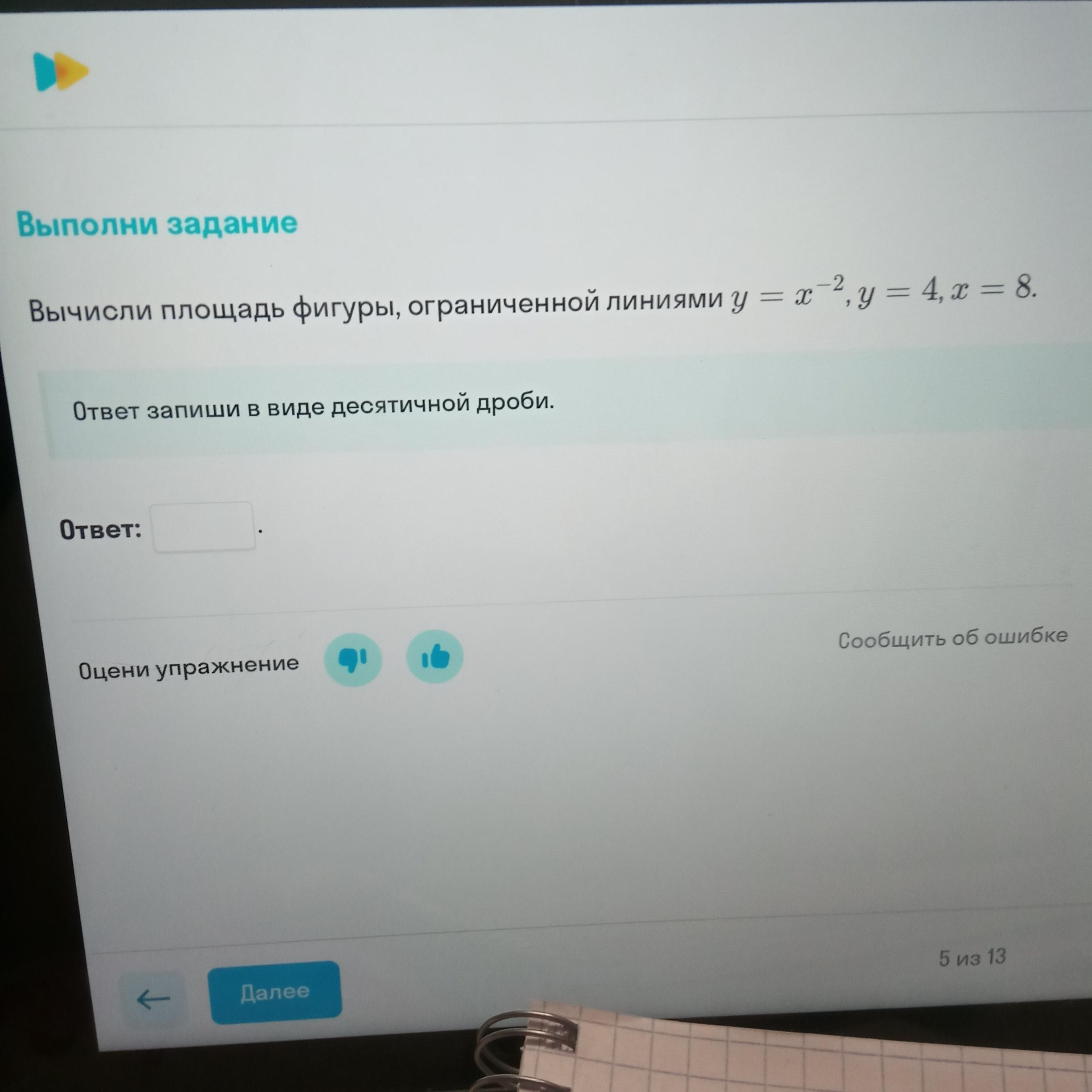 Вычислите площадь фигуры, ограниченной линиями y=x^-2, y=4, x=4.