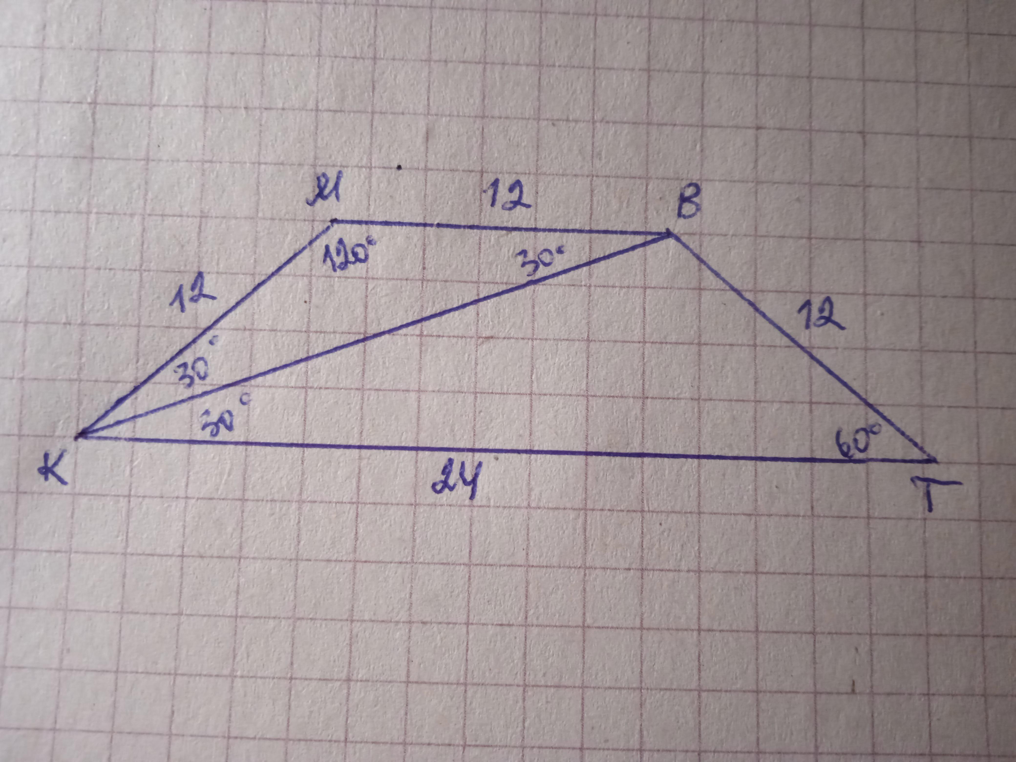 ΔКМВ - рівнобічний, КМ=МВ=12 см, ВТ=КМ=12 см.; ∠КМВ=∠МВК=60:2=30°