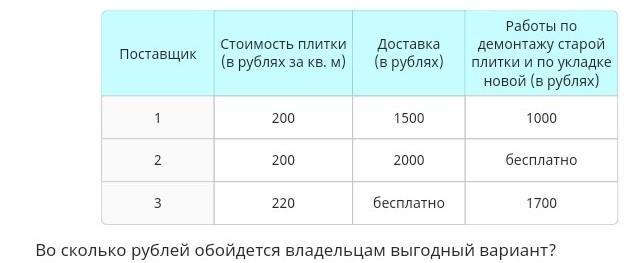 Владельцы домохозяйства планируют обновить всю тротуарную плитку (и дорожки, и площадку между гаражом и колодцем) В таблице предоставленны условия трёх поставщиков плитки